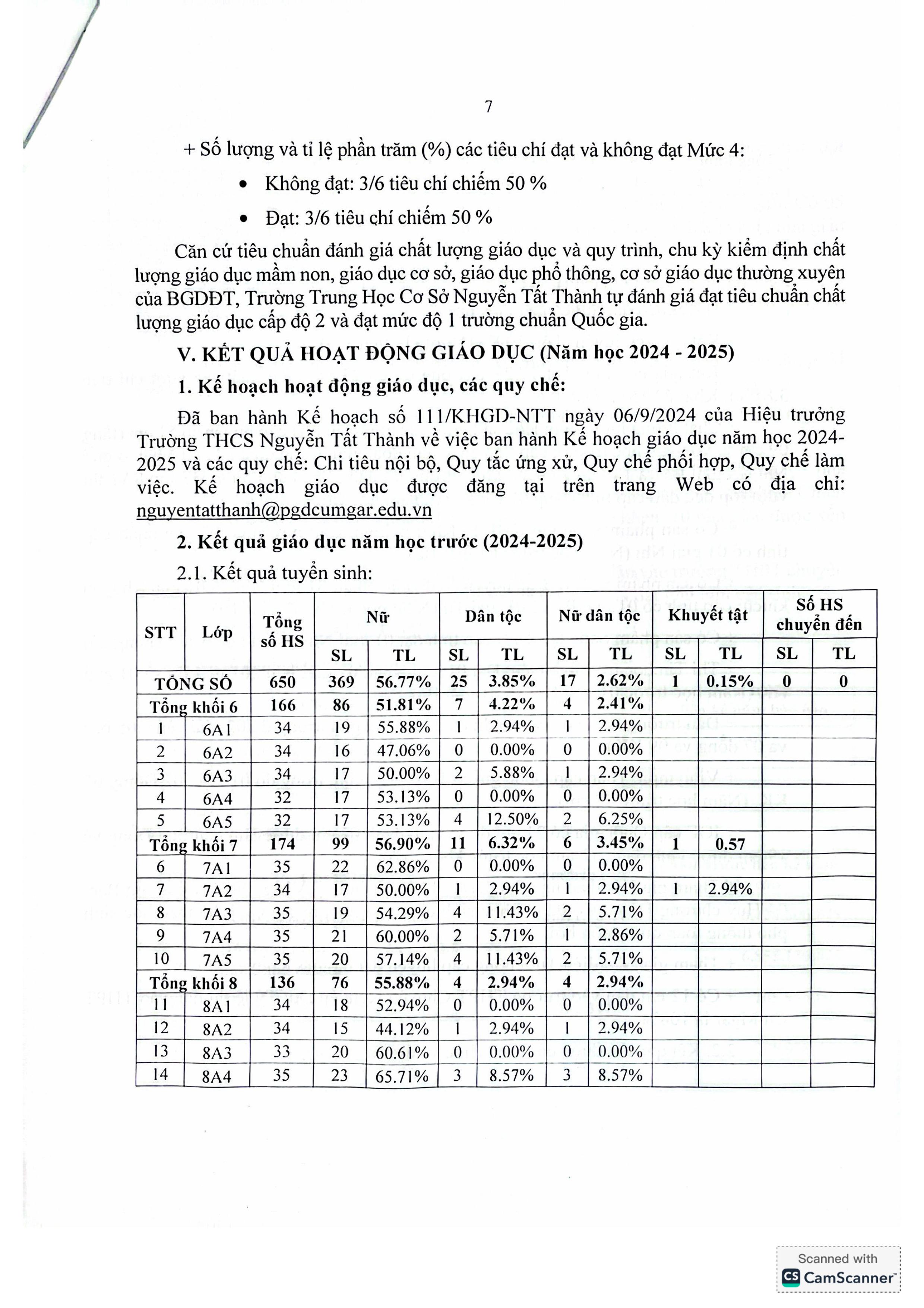 KẾT QUẢ CHẤM KIỂM TRA, ĐÁNH GIÁ NĂNG LỰC TUYỂN SINH VÀO LỚP 6 NĂM HỌC 2024 -2025 TRƯỜNG THCS NGUYỄN TẤT THÀNH