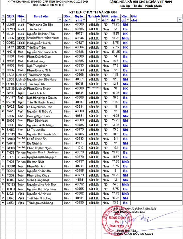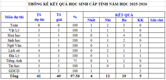 Trong kỳ thi chọn Học sinh giỏi các môn văn hóa cấp tỉnh năm học 2025-2026 diễn ra vào ngày 24/3 vừa qua, Đội tuyển HSG Trường THCS Nguyễn Tất Thành, xã Quảng Phú tiếp tục khẳng định chất lượng giáo dục mũi nhọn. Nhiều em đã đạt giải cao, trong đó có 04 giải Nhất, 12 giải Nhì, 19 giải Ba và 05 giải Khuyến khích. Cụ thể: