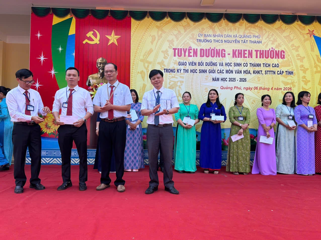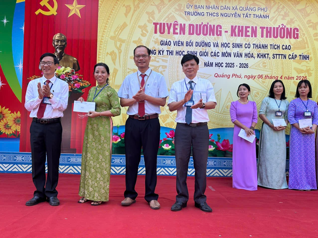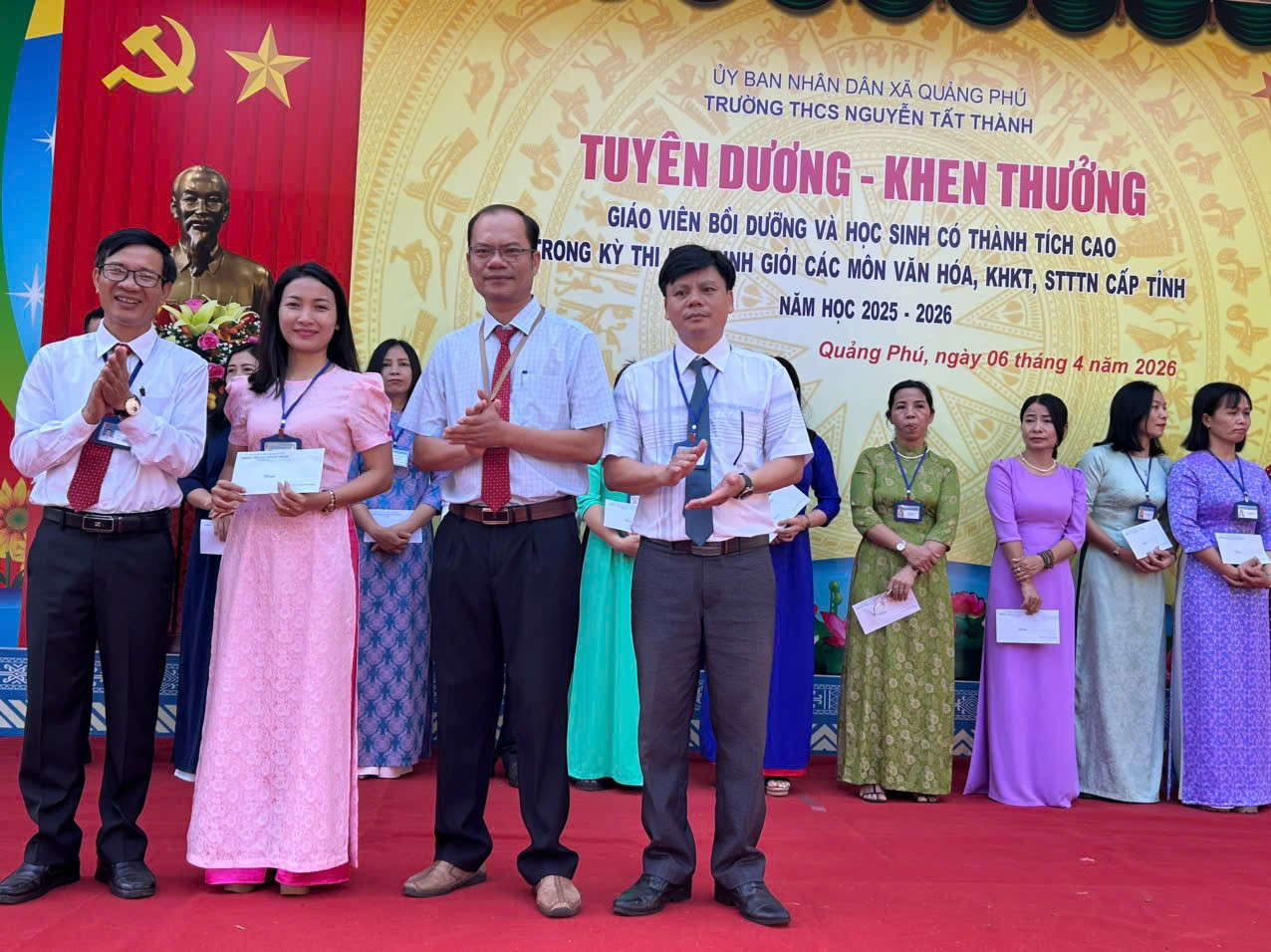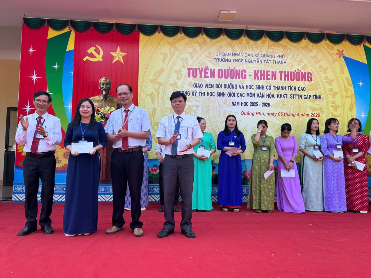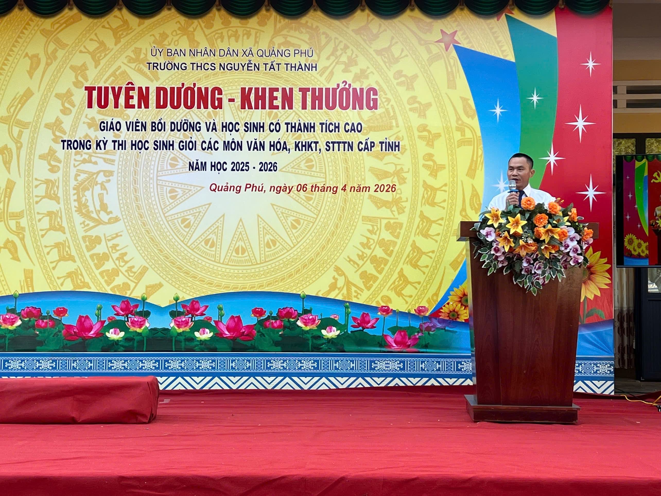 Sáng ngày 05 tháng 4 năm 2026, Trường THCS Nguyễn Tất Thành, xã Quảng Phú đã long trọng tổ chức buổi gặp mặt, tuyên dương và khen thưởng các em học sinh đạt thành tích xuất sắc trong kỳ thi học sinh giỏi các môn văn hóa, KHKT và STTTN cấp tỉnh năm học 2025–2026. Buổi lễ có sự tham gia của Ban ĐDCMHS, toàn thể cán bộ, giáo viên và hơn 600 em học sinh trong toàn trường, tạo nên không khí trang trọng, ấm áp và đầy ý nghĩa.
