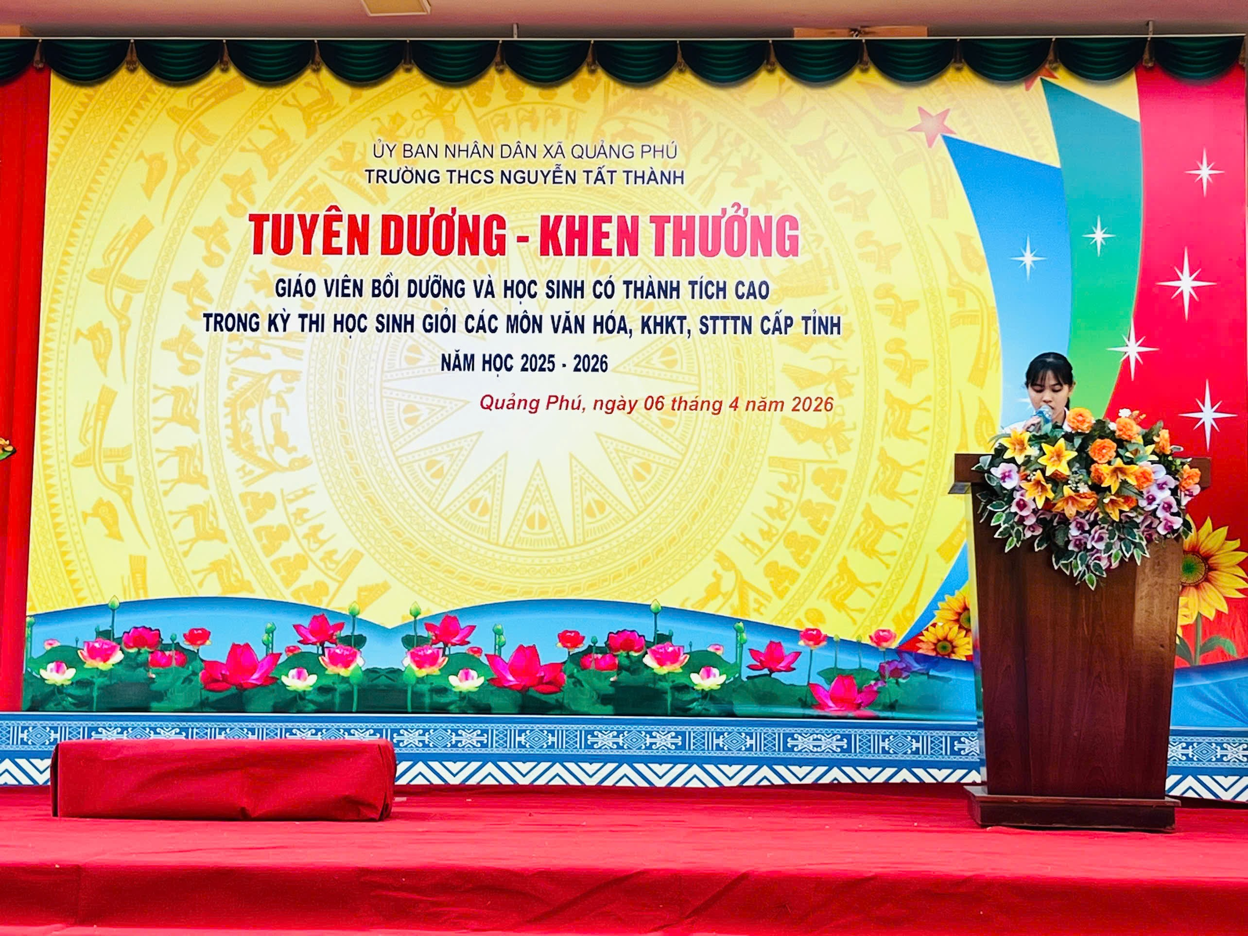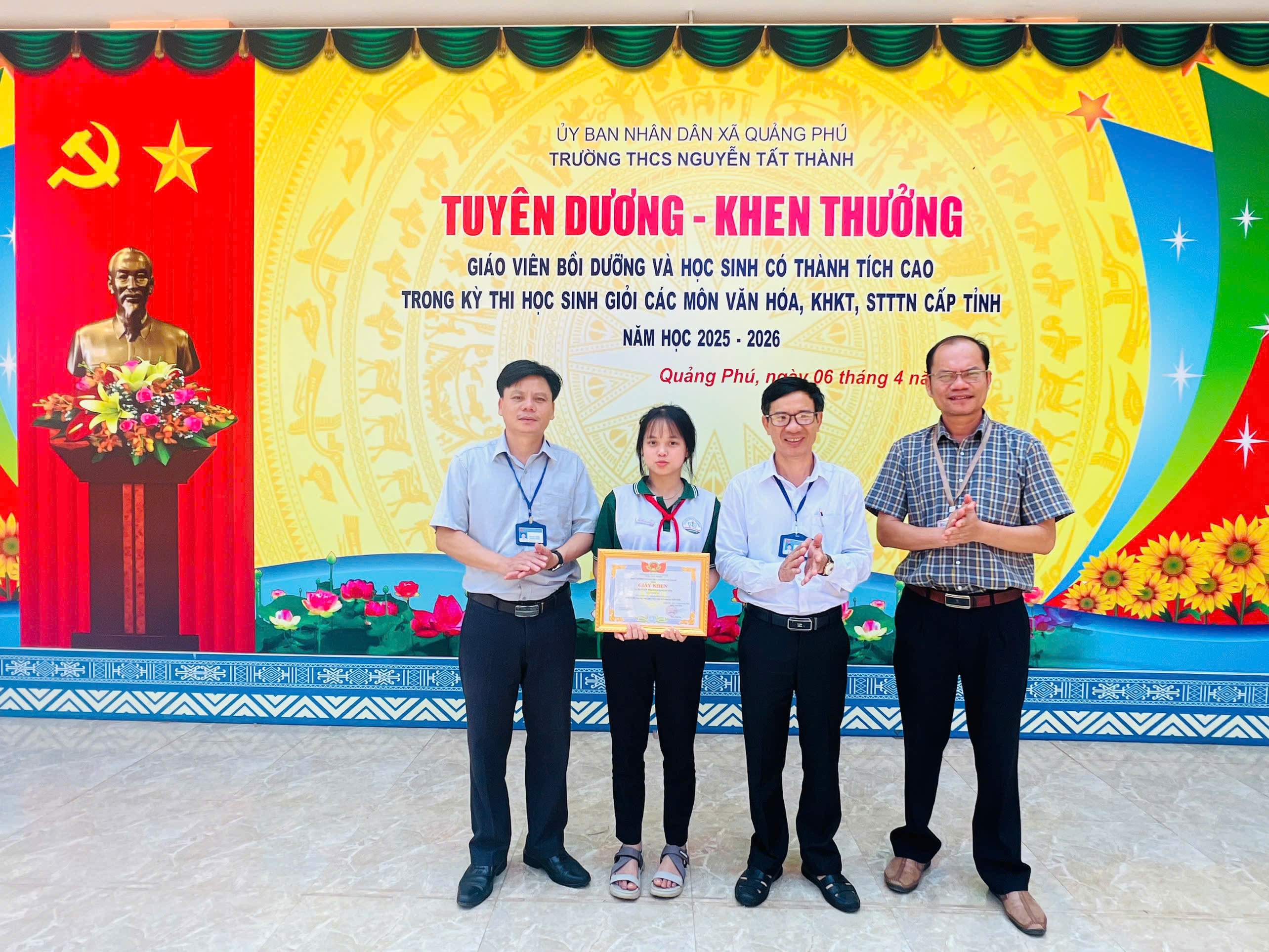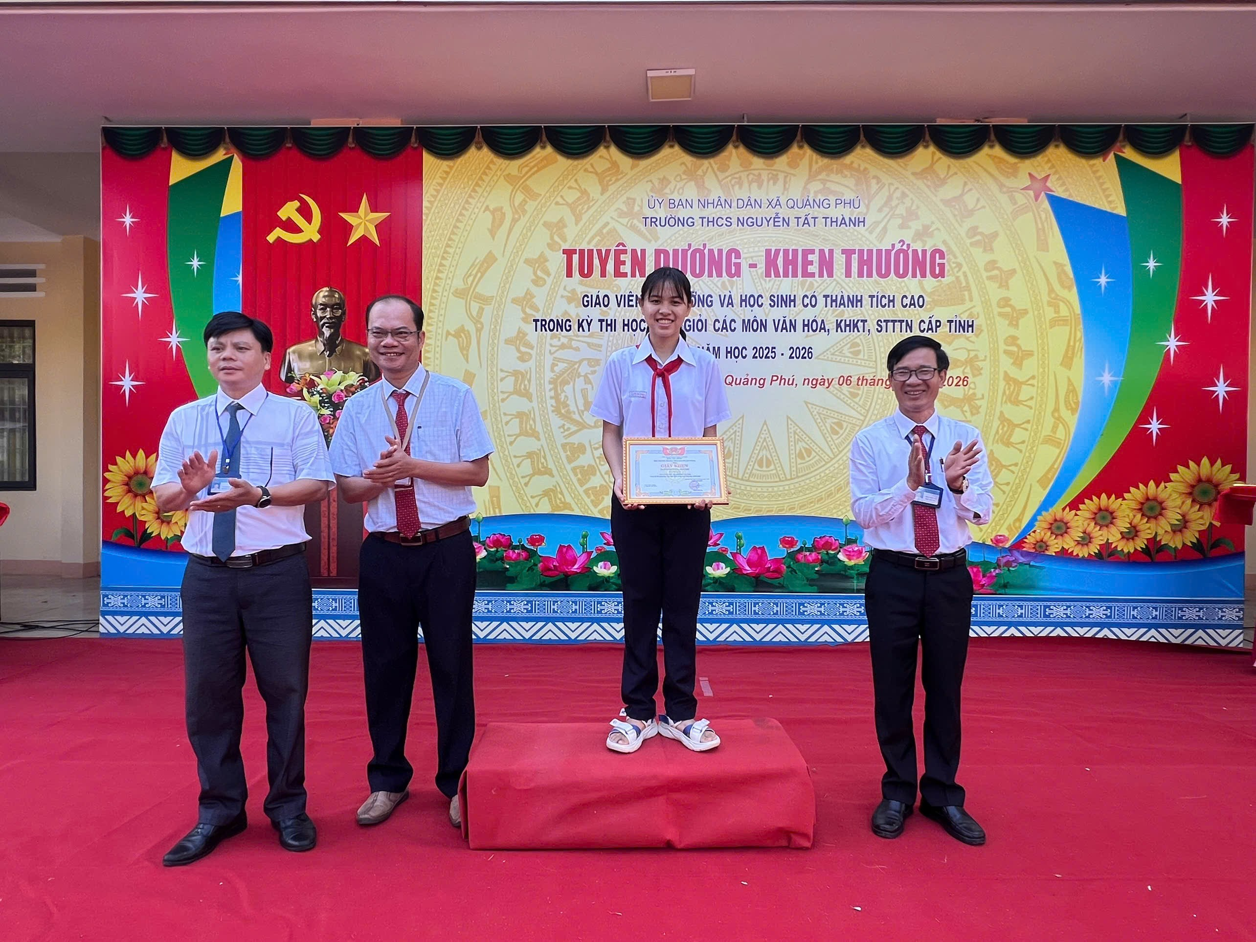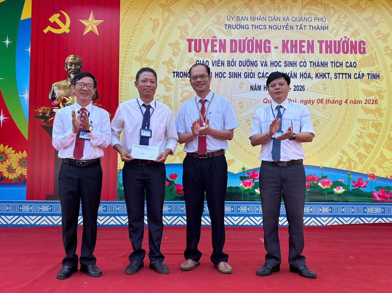 Sáng ngày 05 tháng 4 năm 2026, Trường THCS Nguyễn Tất Thành, xã Quảng Phú đã long trọng tổ chức buổi gặp mặt, tuyên dương và khen thưởng các em học sinh đạt thành tích xuất sắc trong kỳ thi học sinh giỏi các môn văn hóa, KHKT và STTTN cấp tỉnh năm học 2025–2026. Buổi lễ có sự tham gia của Ban ĐDCMHS, toàn thể cán bộ, giáo viên và hơn 600 em học sinh trong toàn trường, tạo nên không khí trang trọng, ấm áp và đầy ý nghĩa.