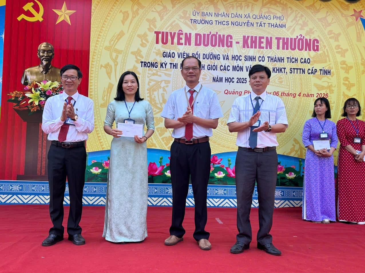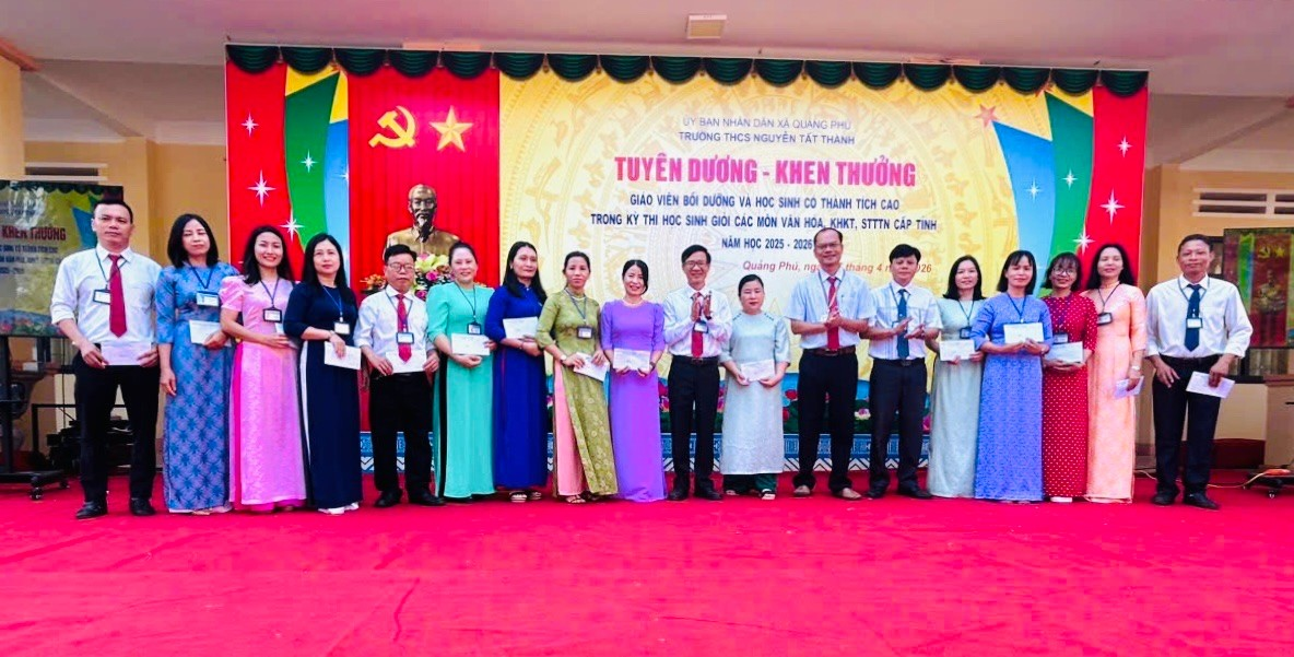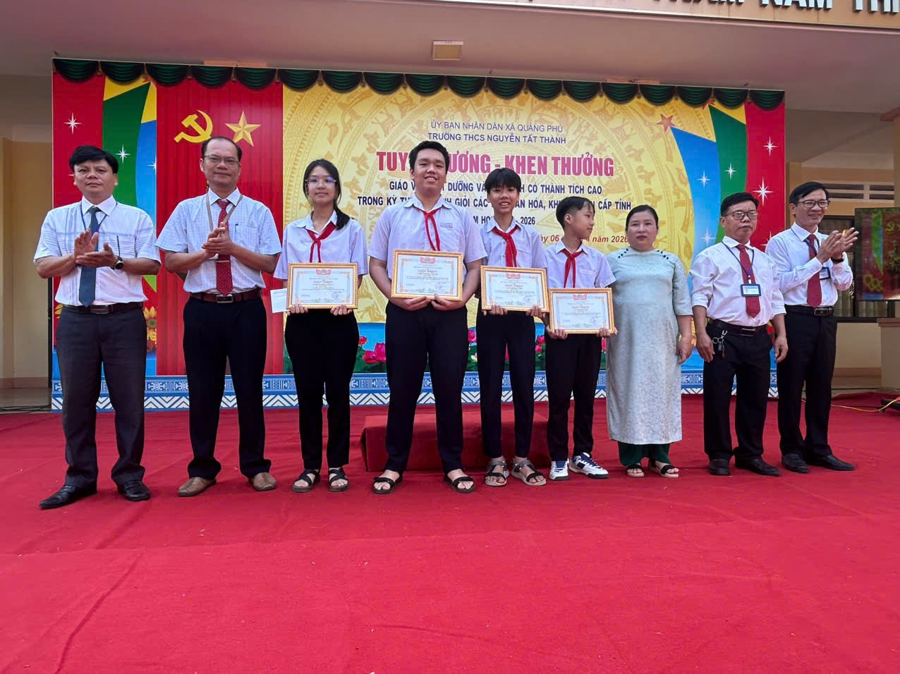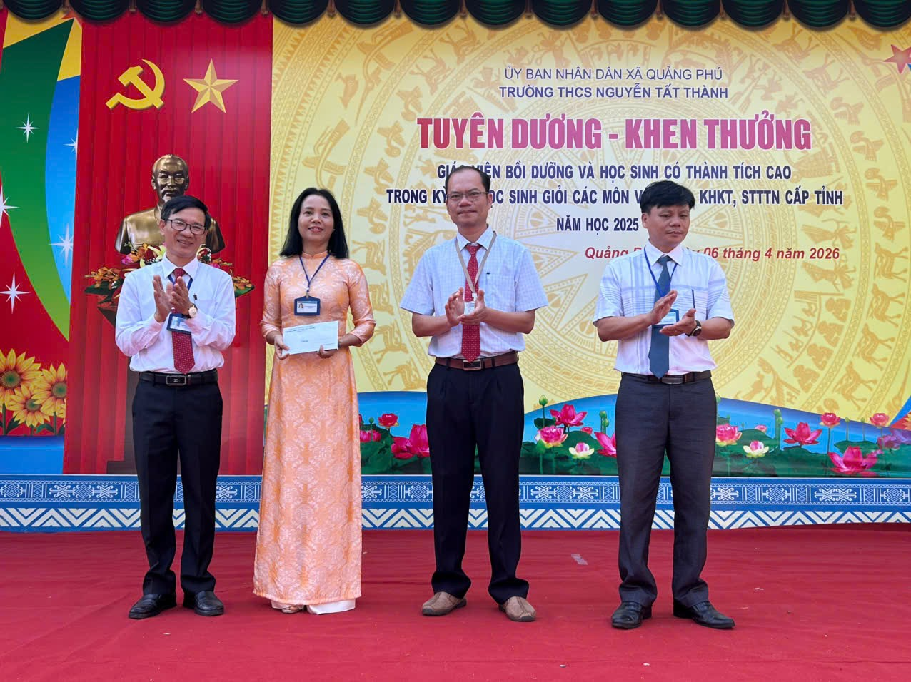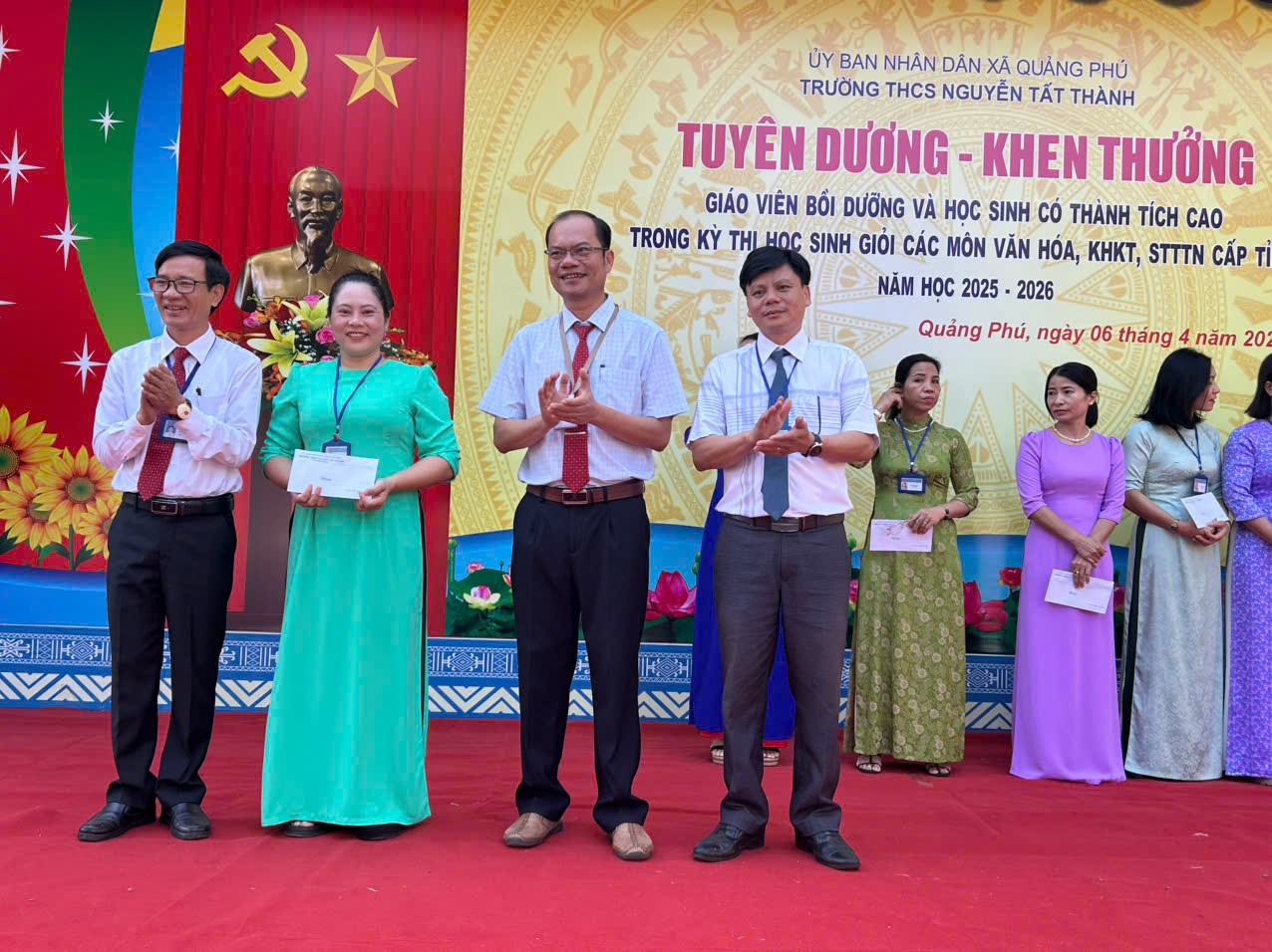 Sáng ngày 05 tháng 4 năm 2026, Trường THCS Nguyễn Tất Thành, xã Quảng Phú đã long trọng tổ chức buổi gặp mặt, tuyên dương và khen thưởng các em học sinh đạt thành tích xuất sắc trong kỳ thi học sinh giỏi các môn văn hóa, KHKT và STTTN cấp tỉnh năm học 2025–2026. Buổi lễ có sự tham gia của Ban ĐDCMHS, toàn thể cán bộ, giáo viên và hơn 600 em học sinh trong toàn trường, tạo nên không khí trang trọng, ấm áp và đầy ý nghĩa.