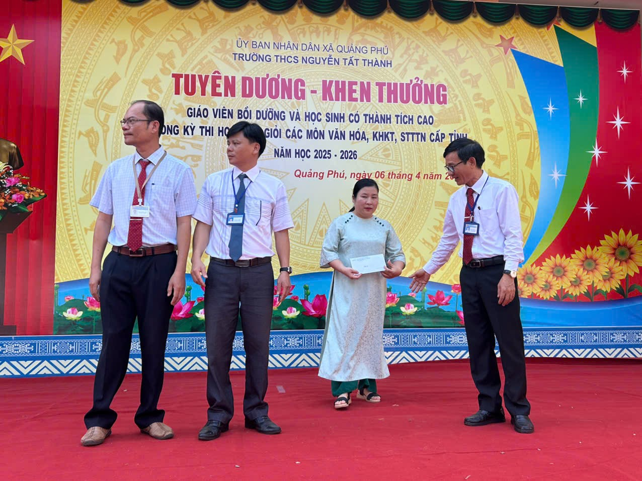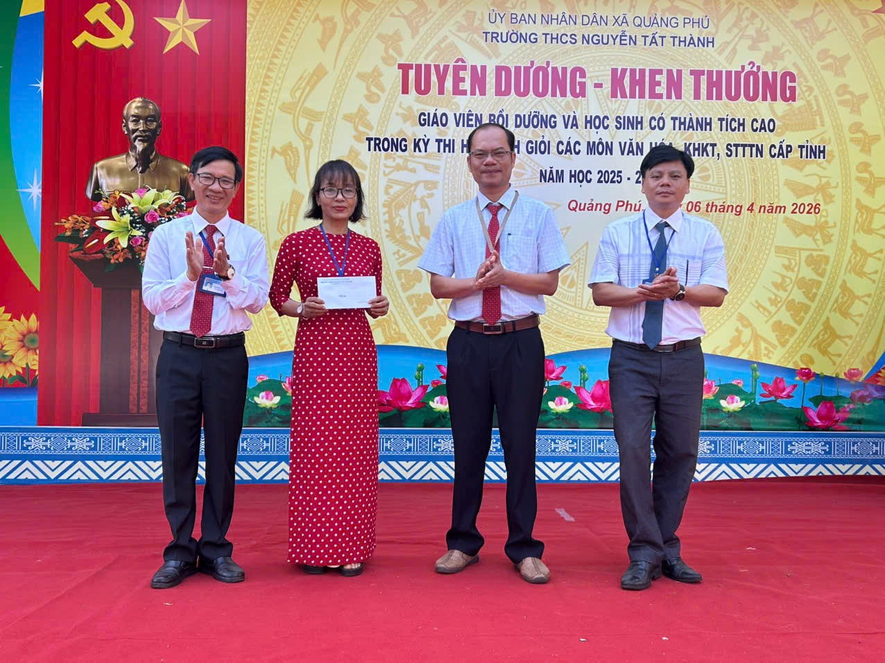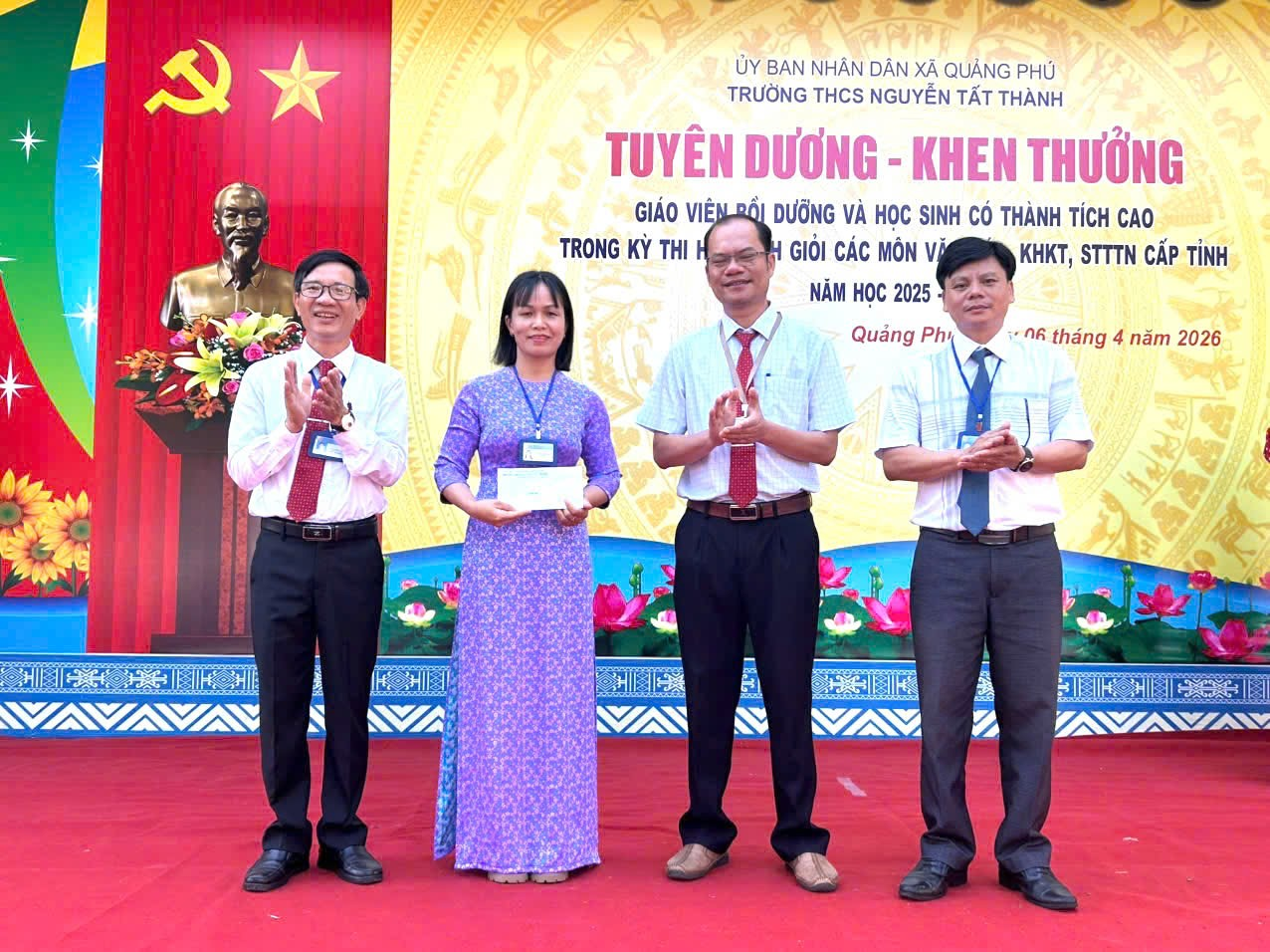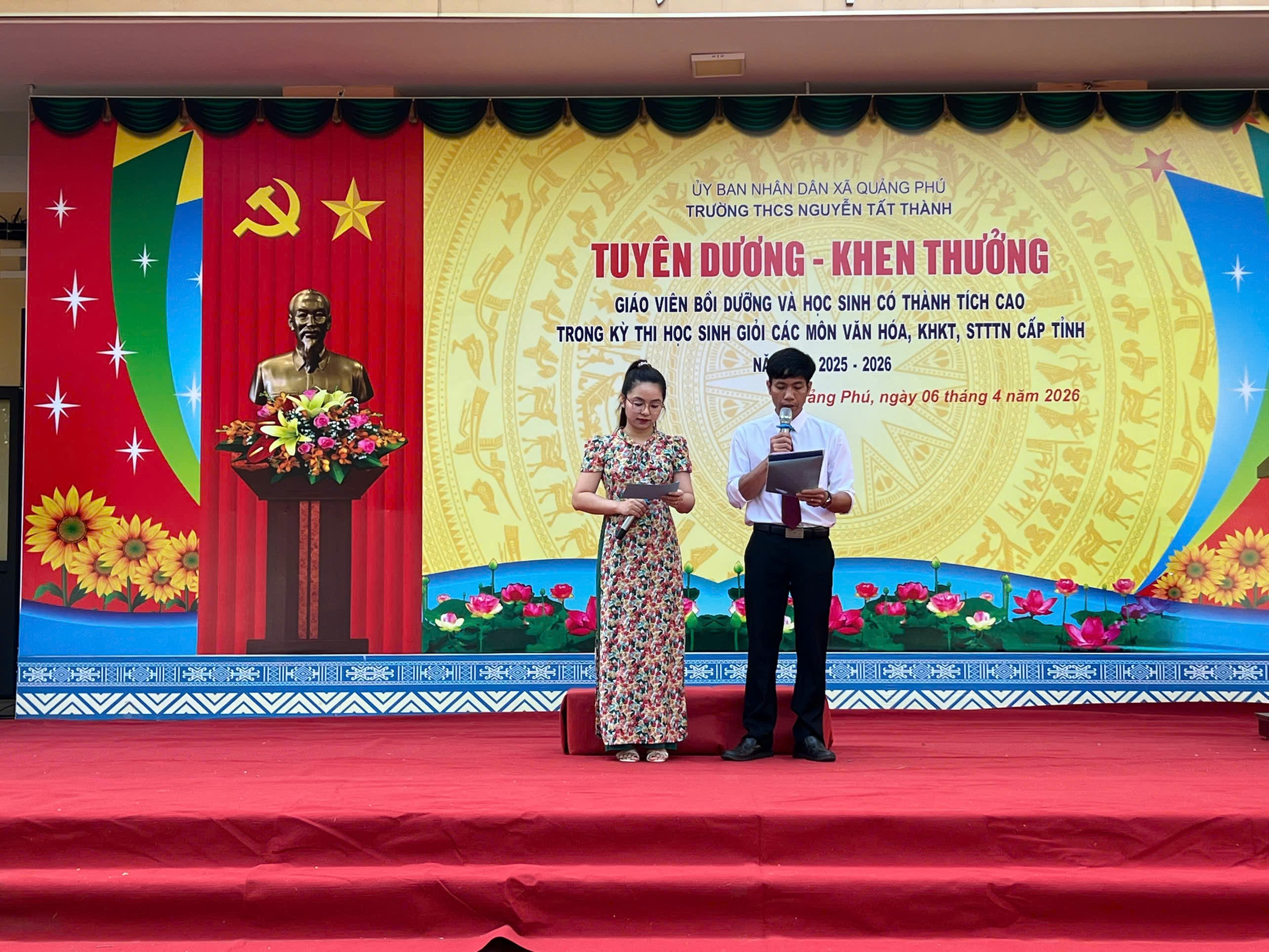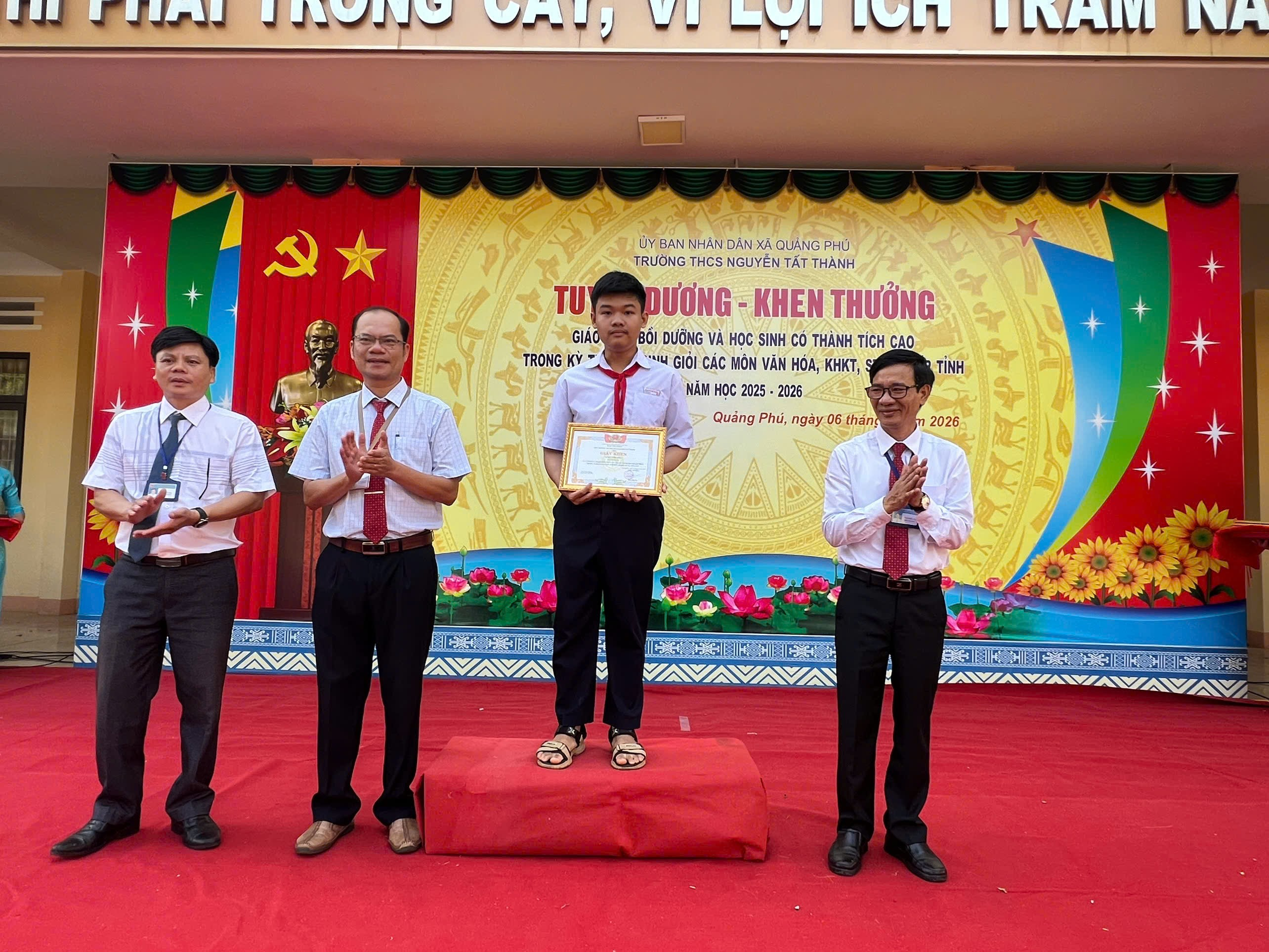 Sáng ngày 05 tháng 4 năm 2026, Trường THCS Nguyễn Tất Thành, xã Quảng Phú đã long trọng tổ chức buổi gặp mặt, tuyên dương và khen thưởng các em học sinh đạt thành tích xuất sắc trong kỳ thi học sinh giỏi các môn văn hóa, KHKT và STTTN cấp tỉnh năm học 2025–2026. Buổi lễ có sự tham gia của Ban ĐDCMHS, toàn thể cán bộ, giáo viên và hơn 600 em học sinh trong toàn trường, tạo nên không khí trang trọng, ấm áp và đầy ý nghĩa.