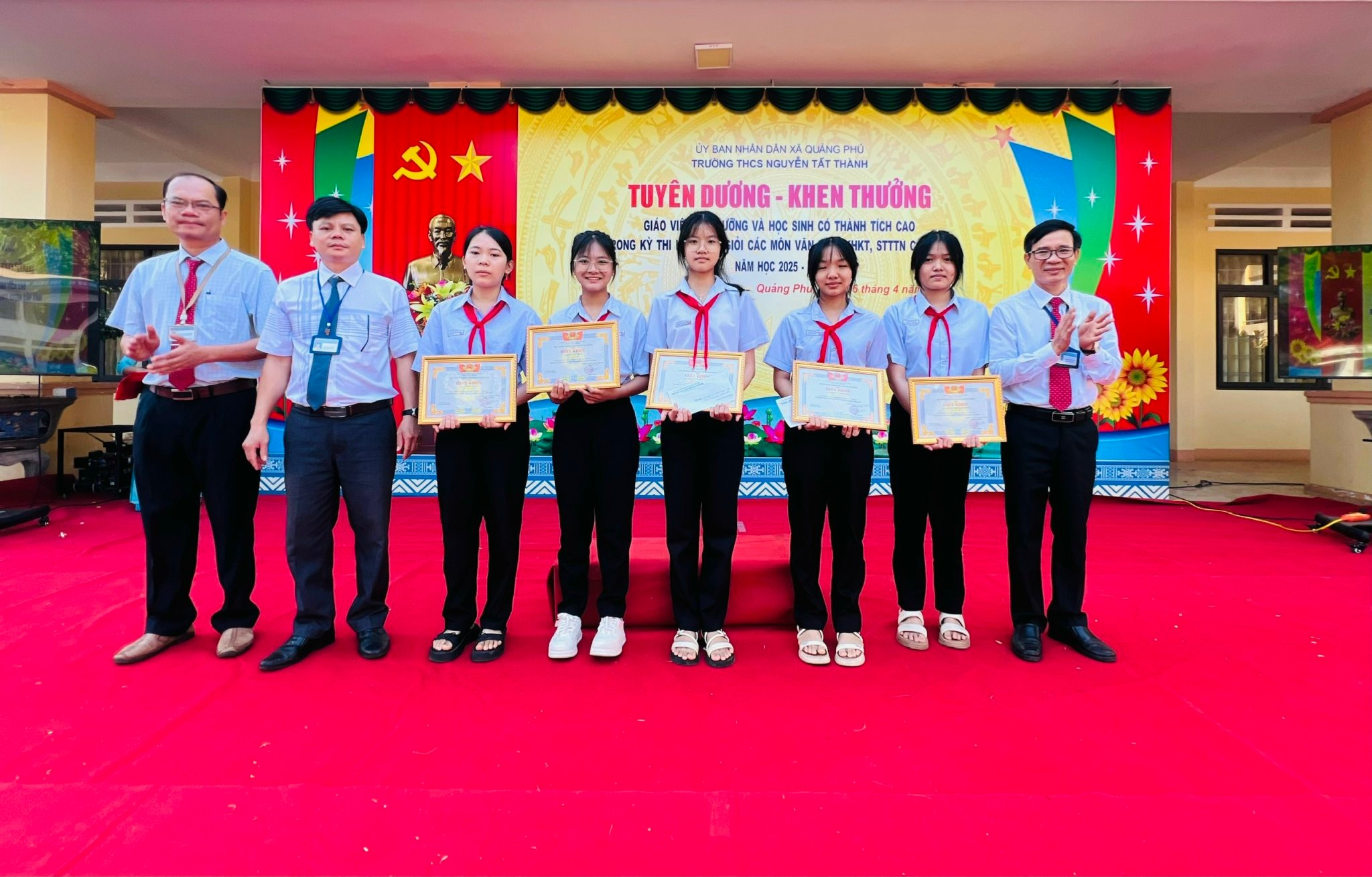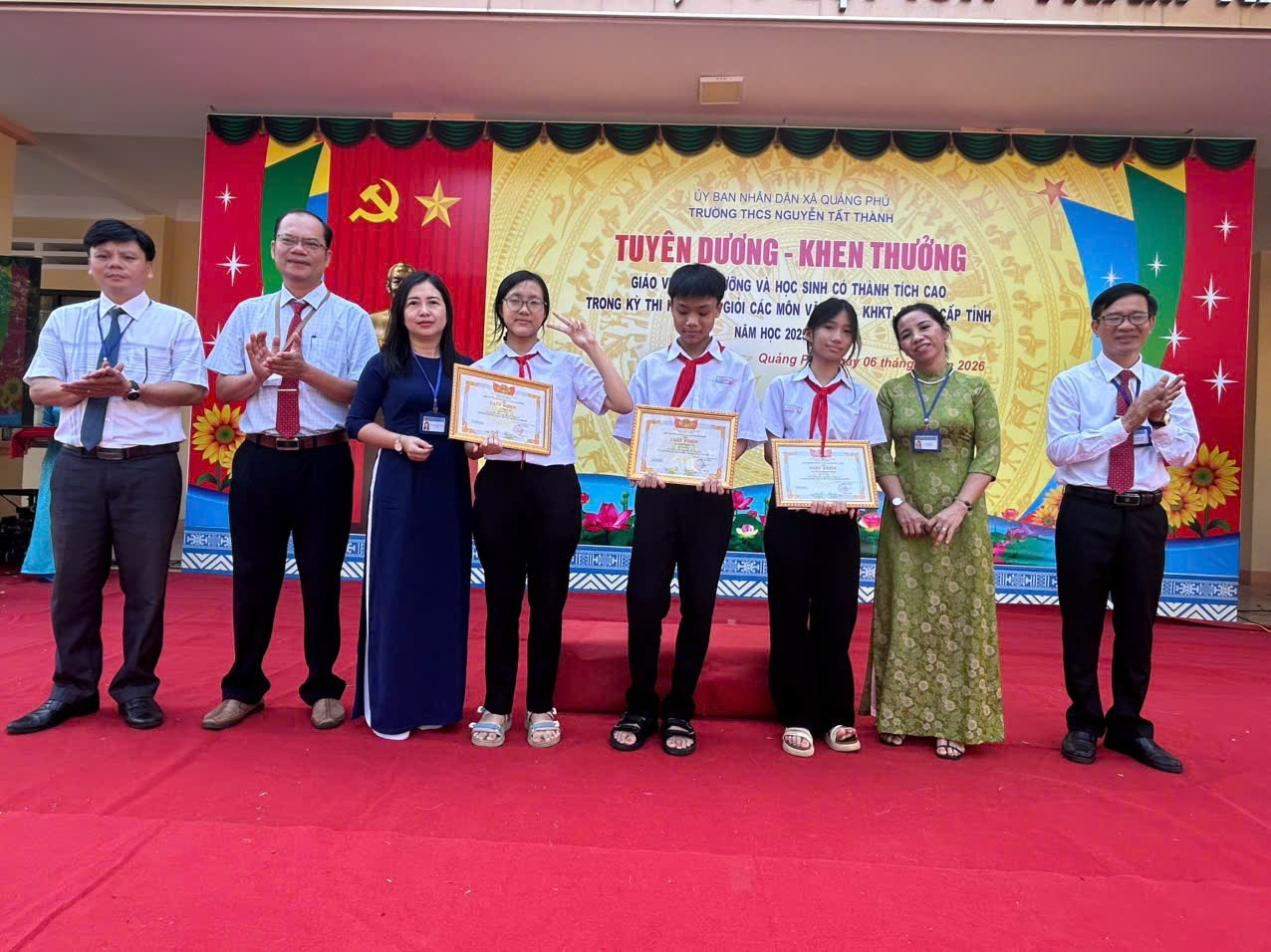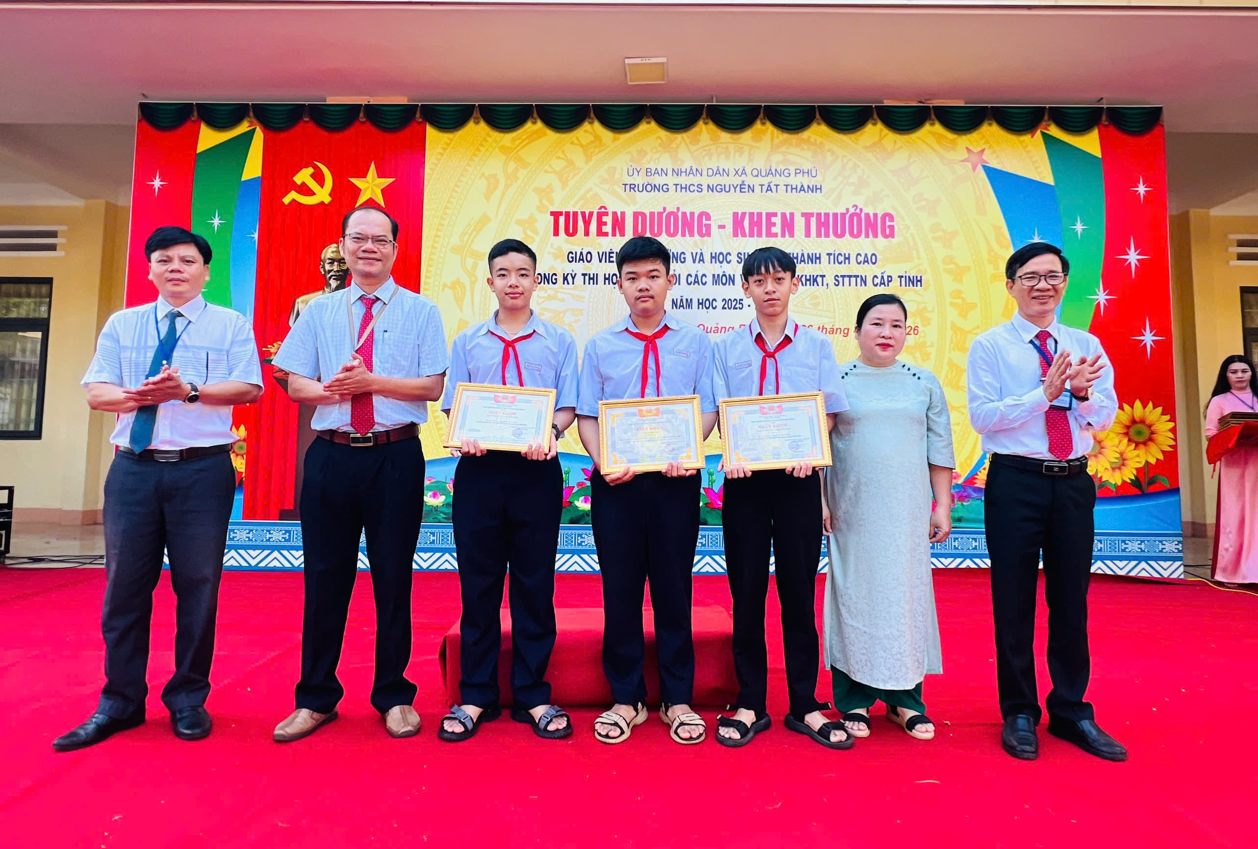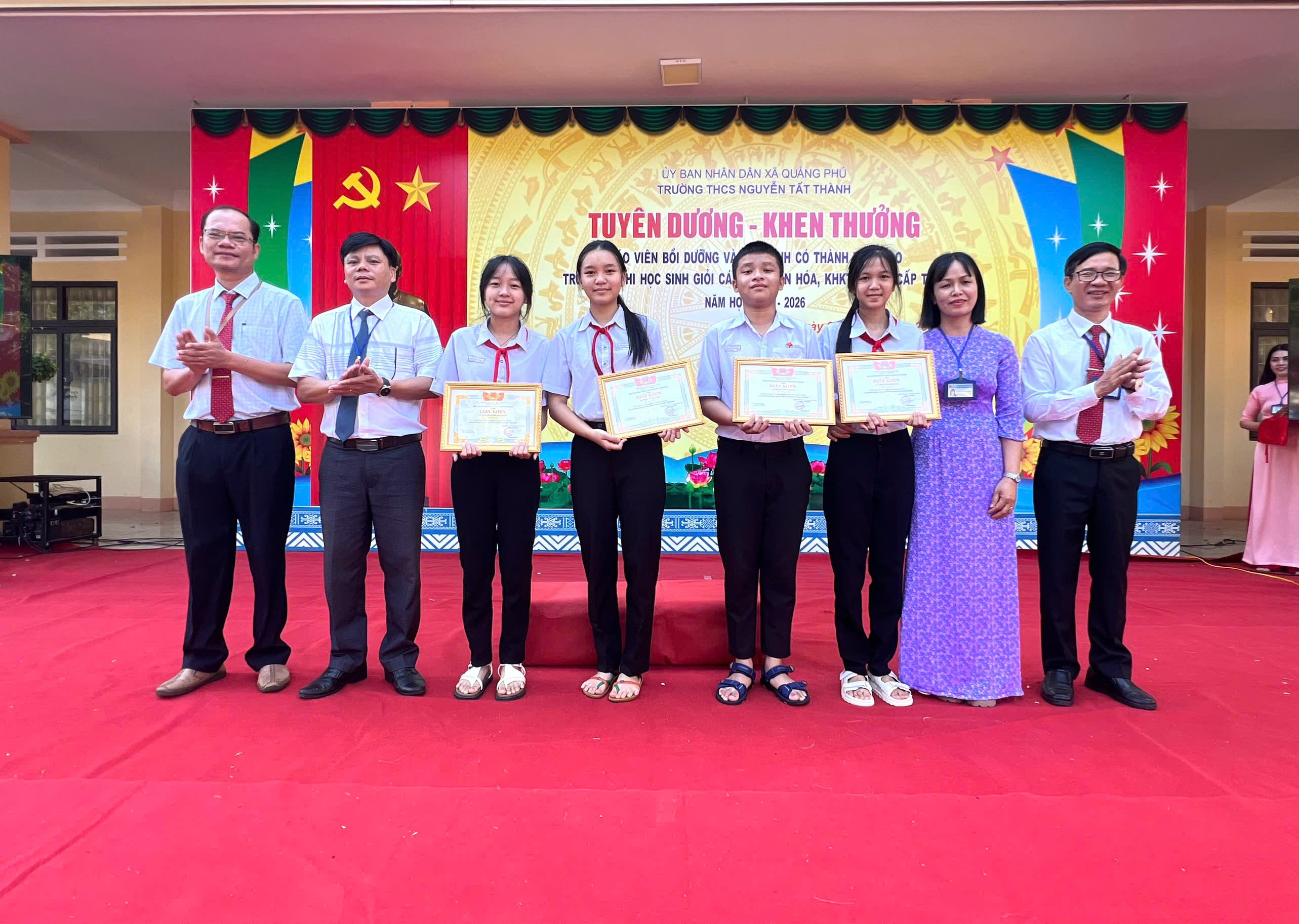 Sáng ngày 05 tháng 4 năm 2026, Trường THCS Nguyễn Tất Thành, xã Quảng Phú đã long trọng tổ chức buổi gặp mặt, tuyên dương và khen thưởng các em học sinh đạt thành tích xuất sắc trong kỳ thi học sinh giỏi các môn văn hóa, KHKT và STTTN cấp tỉnh năm học 2025–2026. Buổi lễ có sự tham gia của Ban ĐDCMHS, toàn thể cán bộ, giáo viên và hơn 600 em học sinh trong toàn trường, tạo nên không khí trang trọng, ấm áp và đầy ý nghĩa.