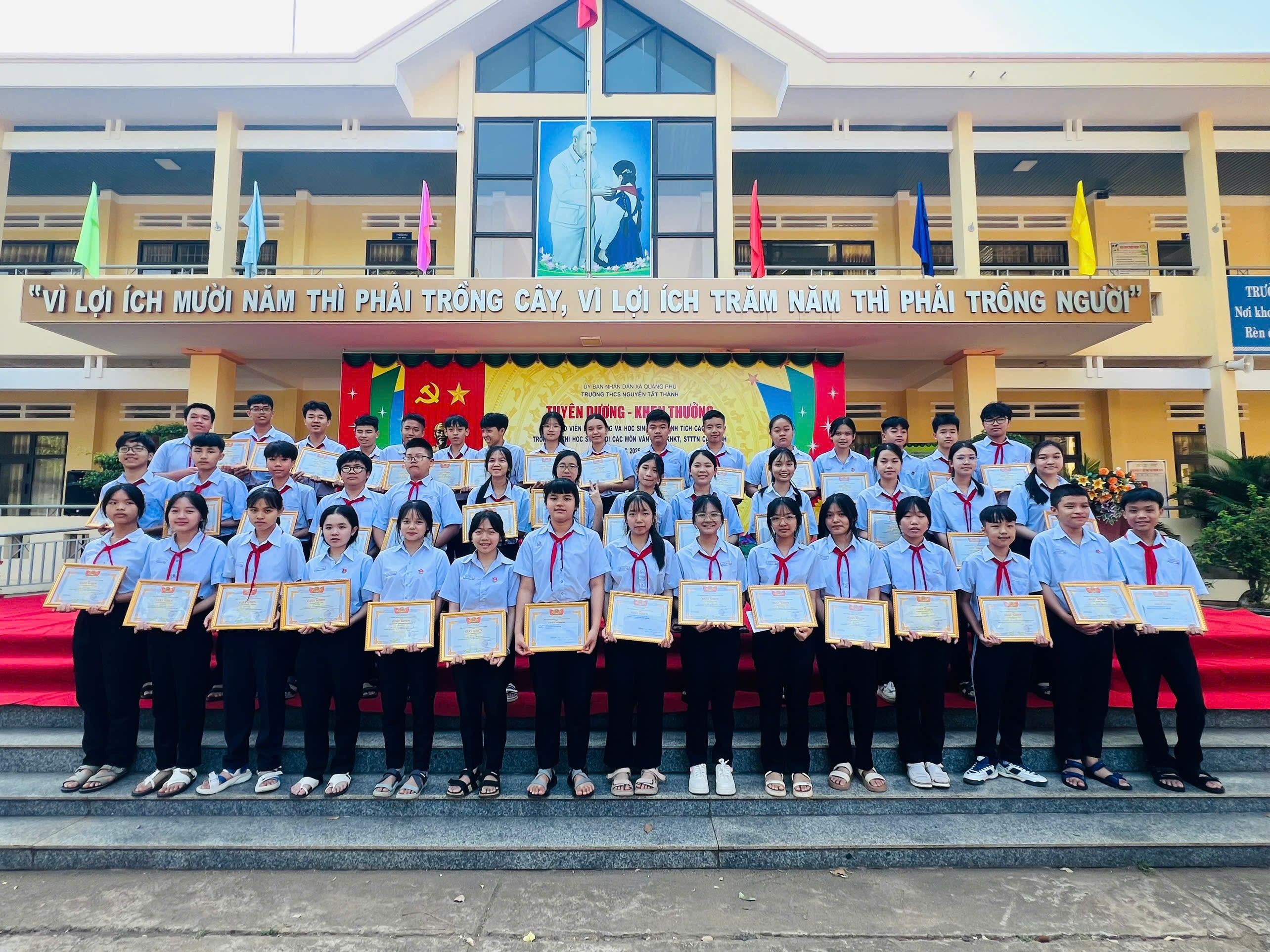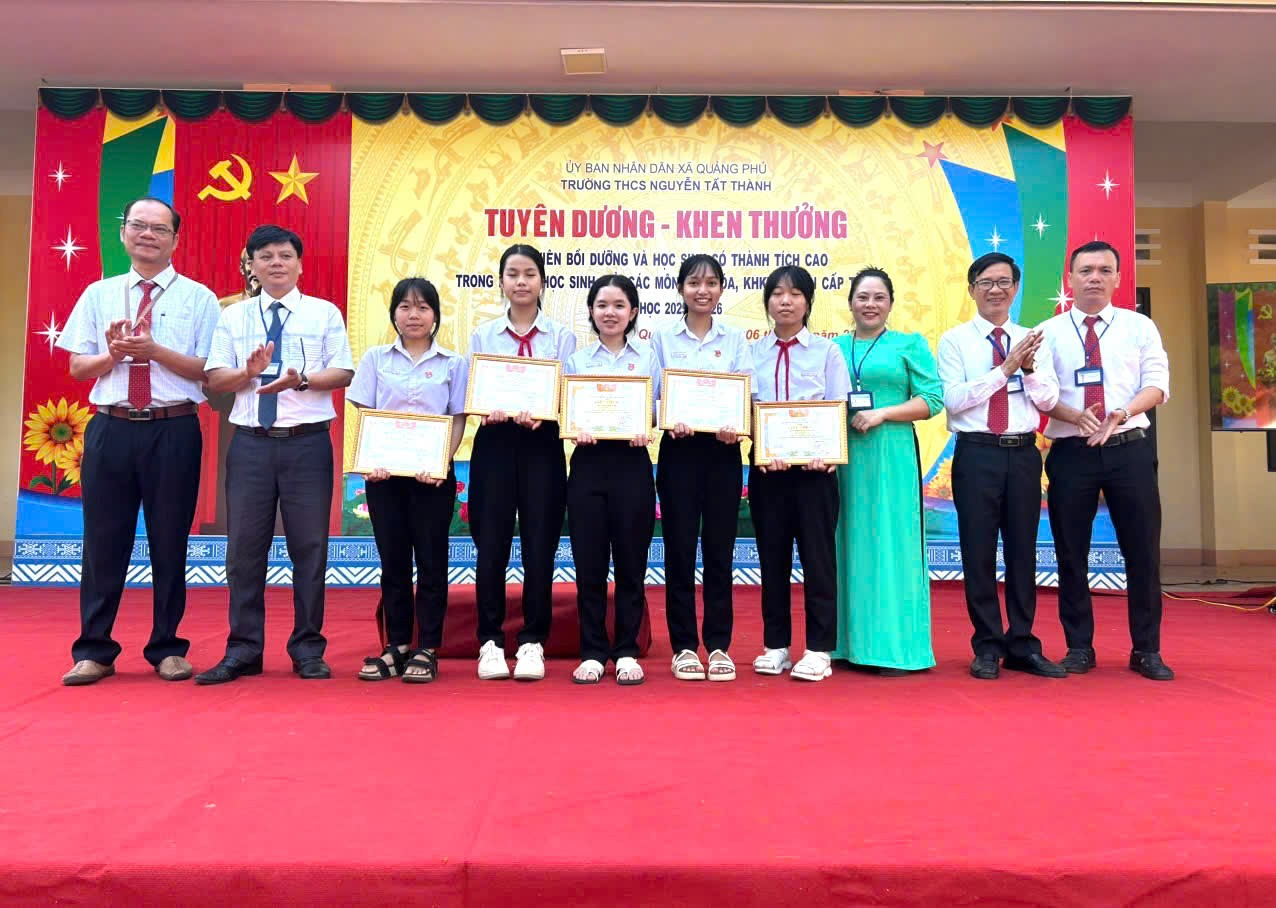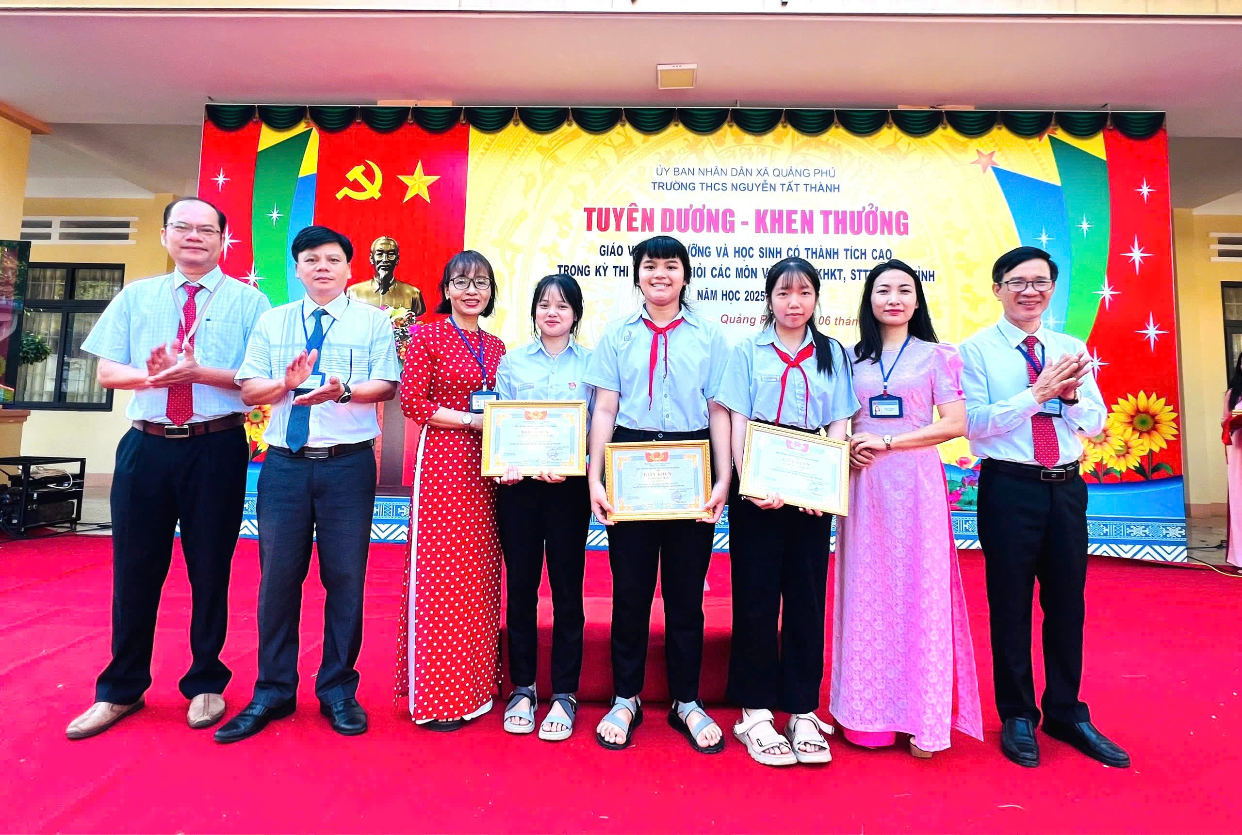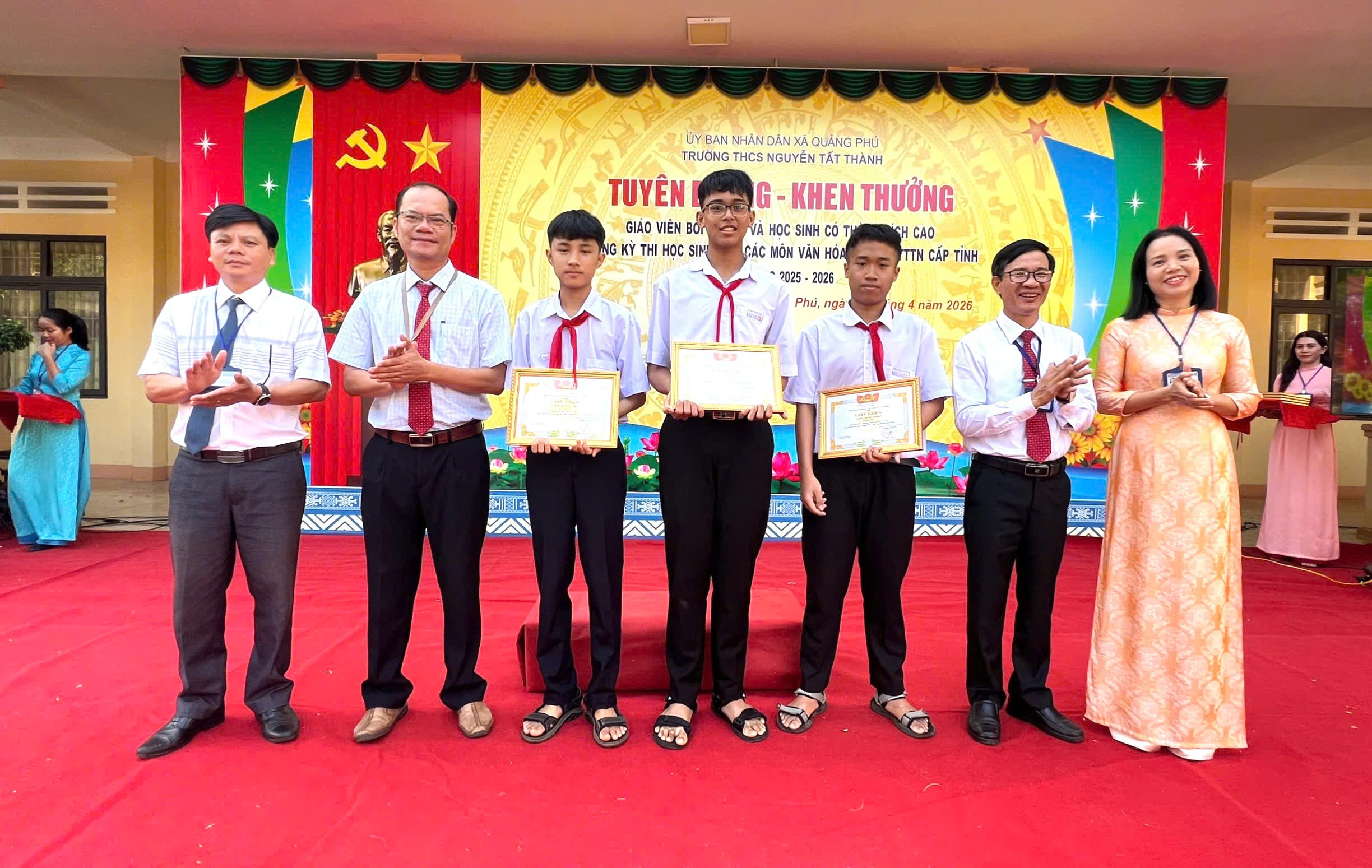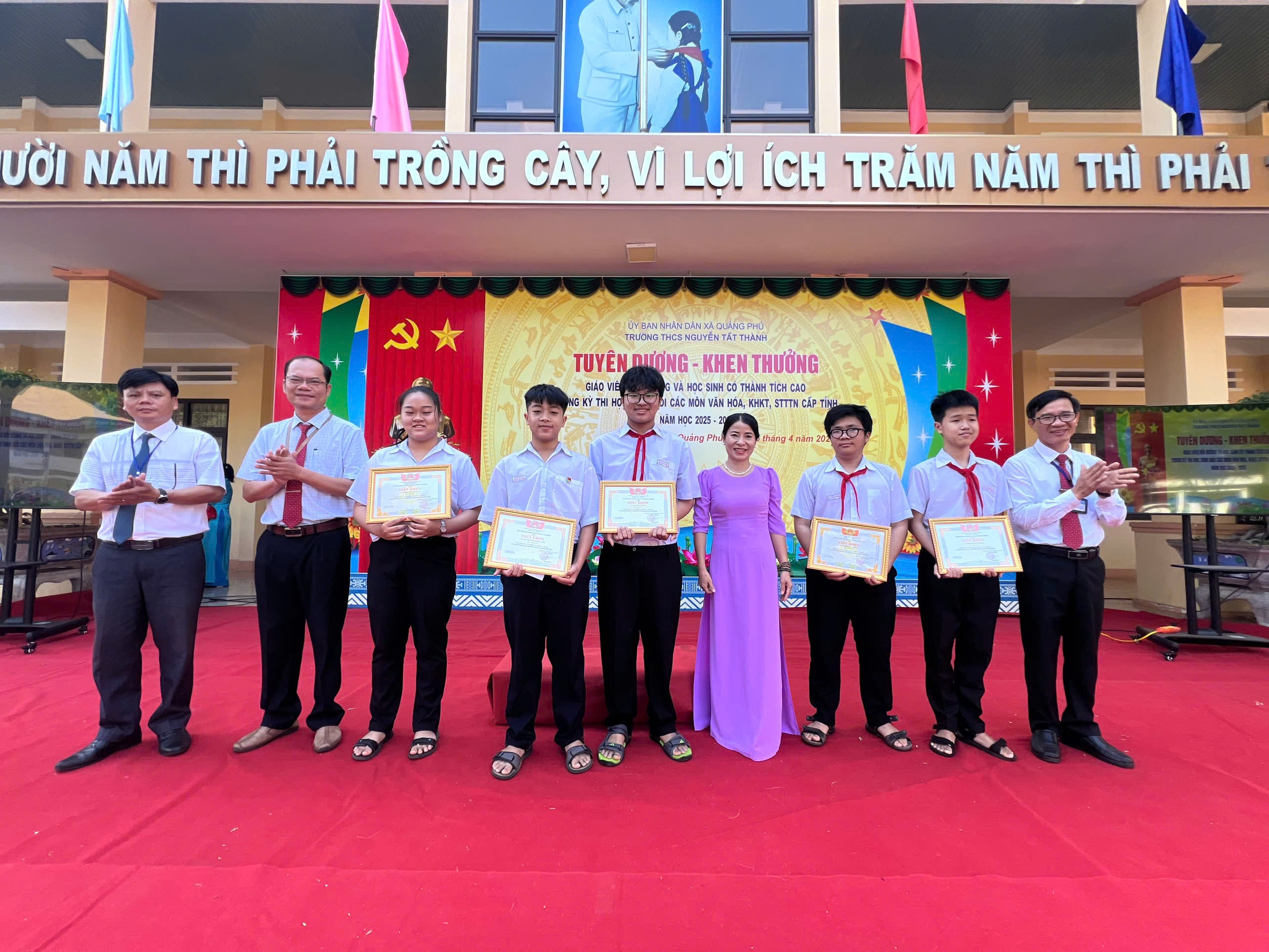 Sáng ngày 05 tháng 4 năm 2026, Trường THCS Nguyễn Tất Thành, xã Quảng Phú đã long trọng tổ chức buổi gặp mặt, tuyên dương và khen thưởng các em học sinh đạt thành tích xuất sắc trong kỳ thi học sinh giỏi các môn văn hóa, KHKT và STTTN cấp tỉnh năm học 2025–2026. Buổi lễ có sự tham gia của Ban ĐDCMHS, toàn thể cán bộ, giáo viên và hơn 600 em học sinh trong toàn trường, tạo nên không khí trang trọng, ấm áp và đầy ý nghĩa.