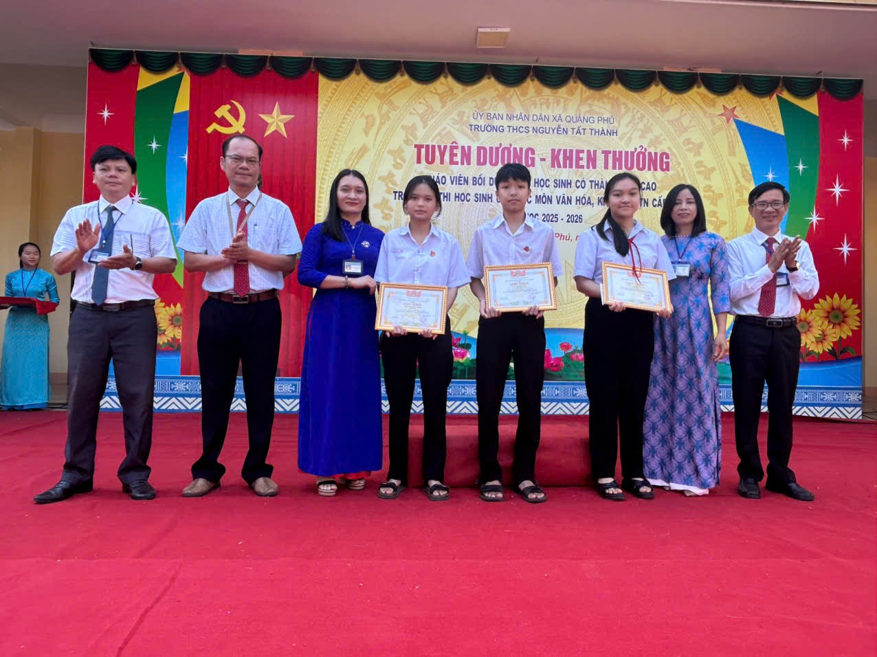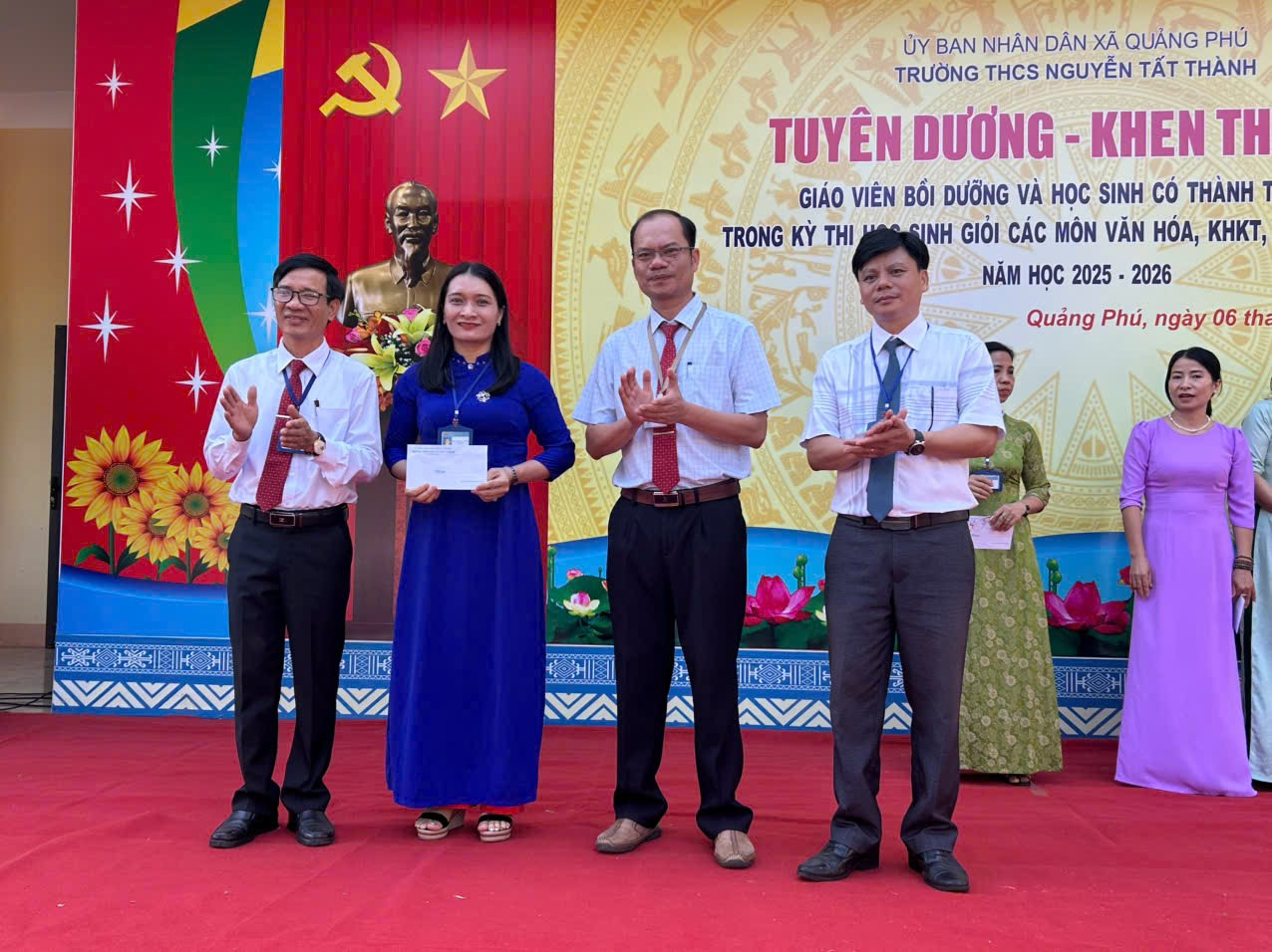 Trường THCS Nguyễn Tất Thành tổ chức tuyên dương, khen thưởng giáo viên bồi dưỡng và học sinh đạt thành tích cao trong các kỳ thi, cuộc thi cấp tỉnh năm học 2025–2026