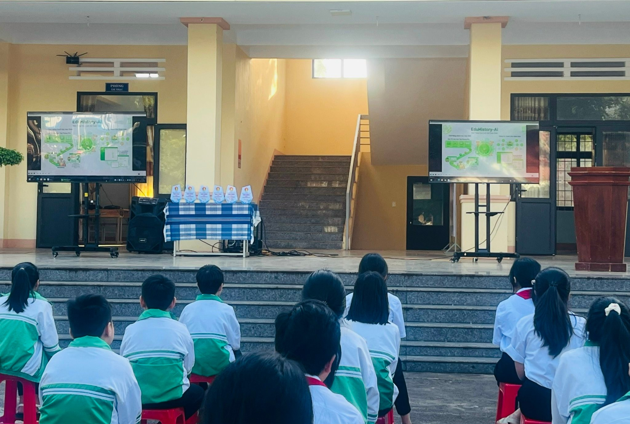 Tại buổi lễ, nhà trường đã tuyên dương các nhóm học sinh cùng giáo viên hướng dẫn có dự án tham gia cuộc thi và đạt kết quả đáng khích lệ. Các sản phẩm dự thi được đánh giá cao về tính sáng tạo, khả năng ứng dụng thực tiễn, thể hiện tinh thần ham học hỏi và đam mê nghiên cứu khoa học của học sinh Bùi Anh Nhật (9A1) và Đỗ Viết Nguyên (8A5) với sản phẩm Phần mềm học Lịch sử tương tác thông minh ứng dụng trí tuệ nhân tạo, do cô giáo Bùi Thị Quỳnh Như hướng dẫn đã đạt giải Ba và sản phẩm của em Phạm Trương Ngọc Trí (9A1) cùng em Nguyễn Đoàn Khôi (8A1) với sản phẩm EcoLife Bio-Composite – Phát triển vật liệu composite sinh học từ bã cà phê, do thầy Phạm Ngọc Bắc hướng dẫn cũng đạt giải Ba.